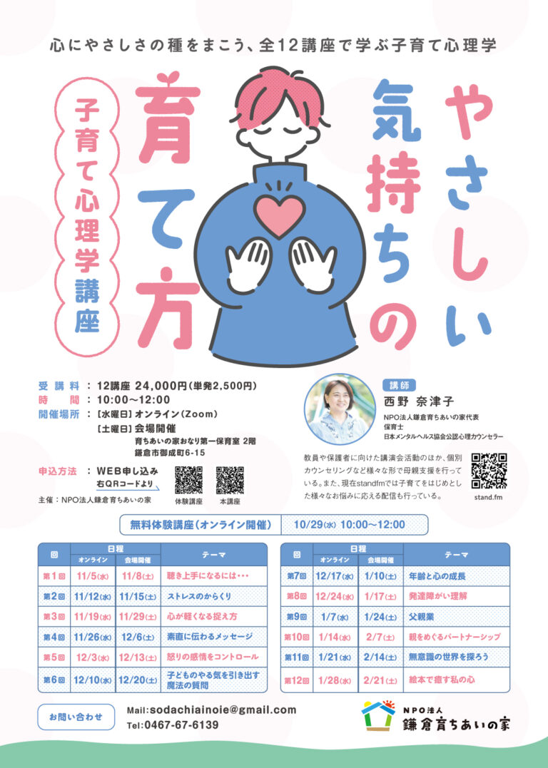 子育て心理学講座〜やさしい気持ちの育て方〜 2025年度 受講者募集!